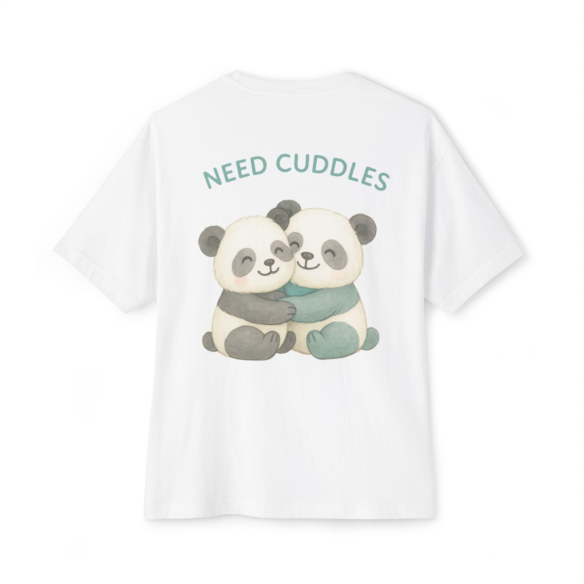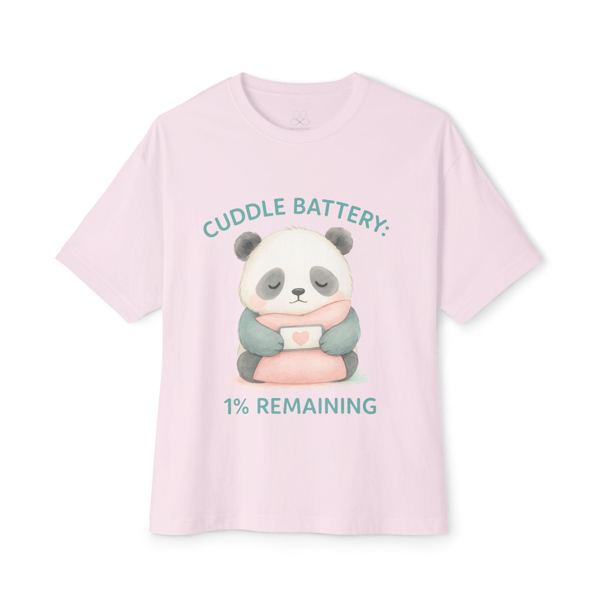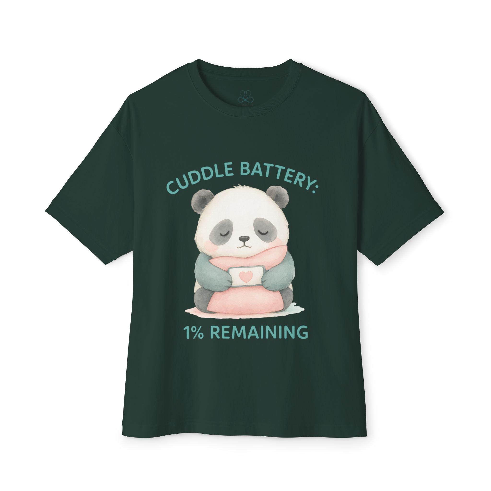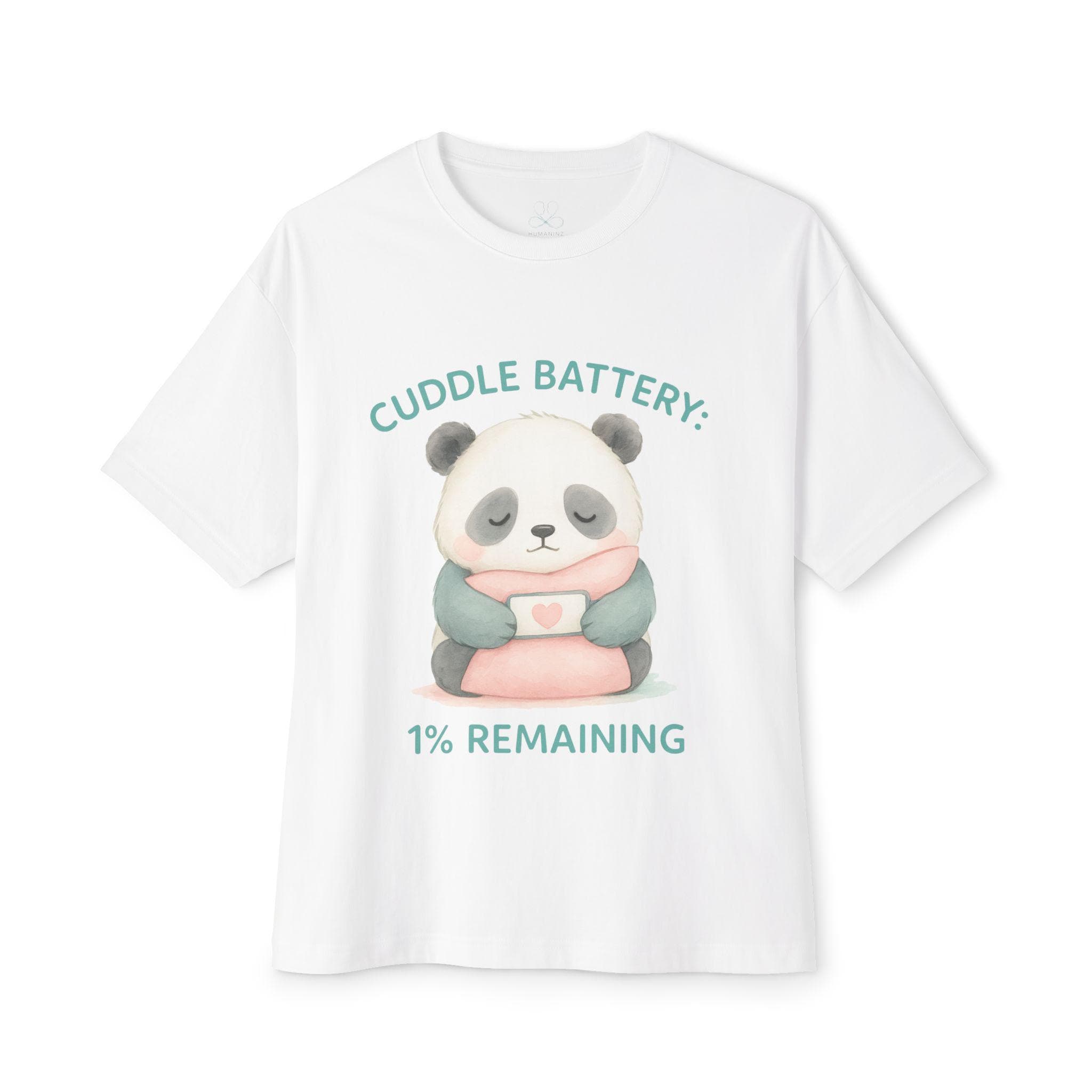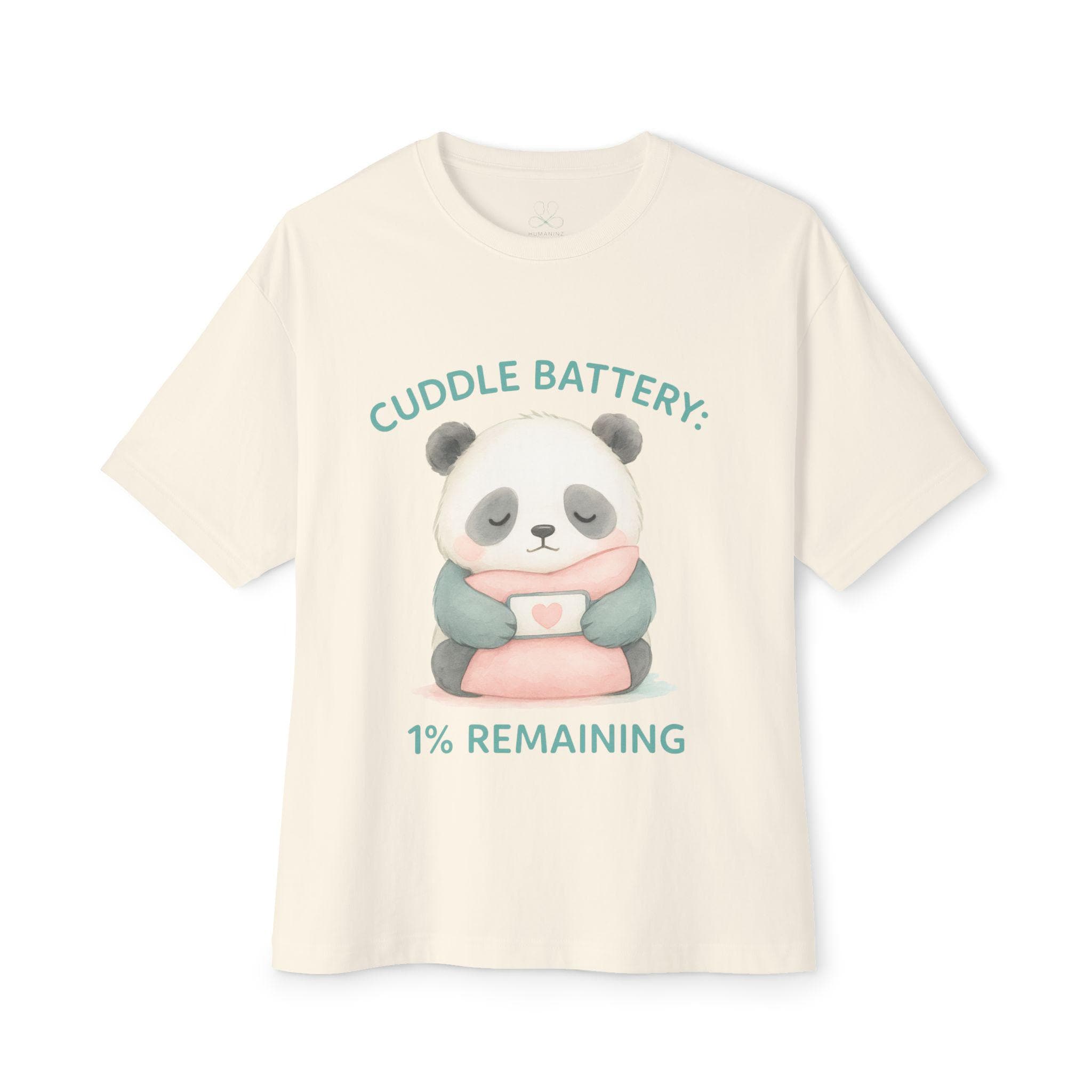 Soft and roomy, this oversized boxy tee carries a gentle, cozy mood. A sleepy panda clutching a heart-warmed mug sits on the front with the caption “Cuddle Battery: 1% Remaining,” while the back shows two pandas embracing under “Need Cuddles.” It feels like a slow afternoon with a blanket and warm drink — simple comfort you can wear. The relaxed, dropped-shoulder silhouette lets the art breathe and the wearer move freely, whether you’re lounging at home, running quick errands, or settling in for a movie night. The muted pastel palette and watercolor-style illustration speak quietly but clearly to anyone craving softness and low-key affection.
