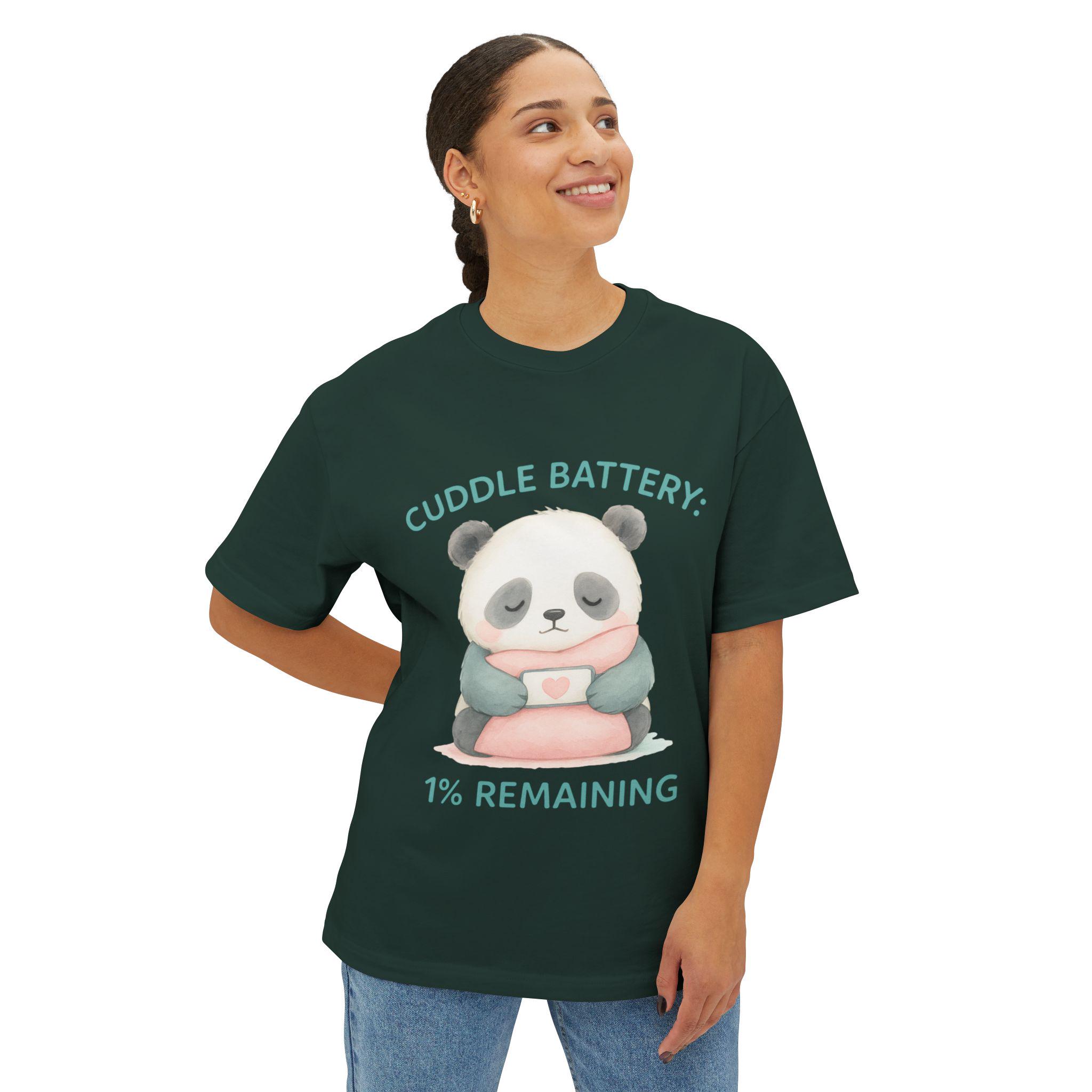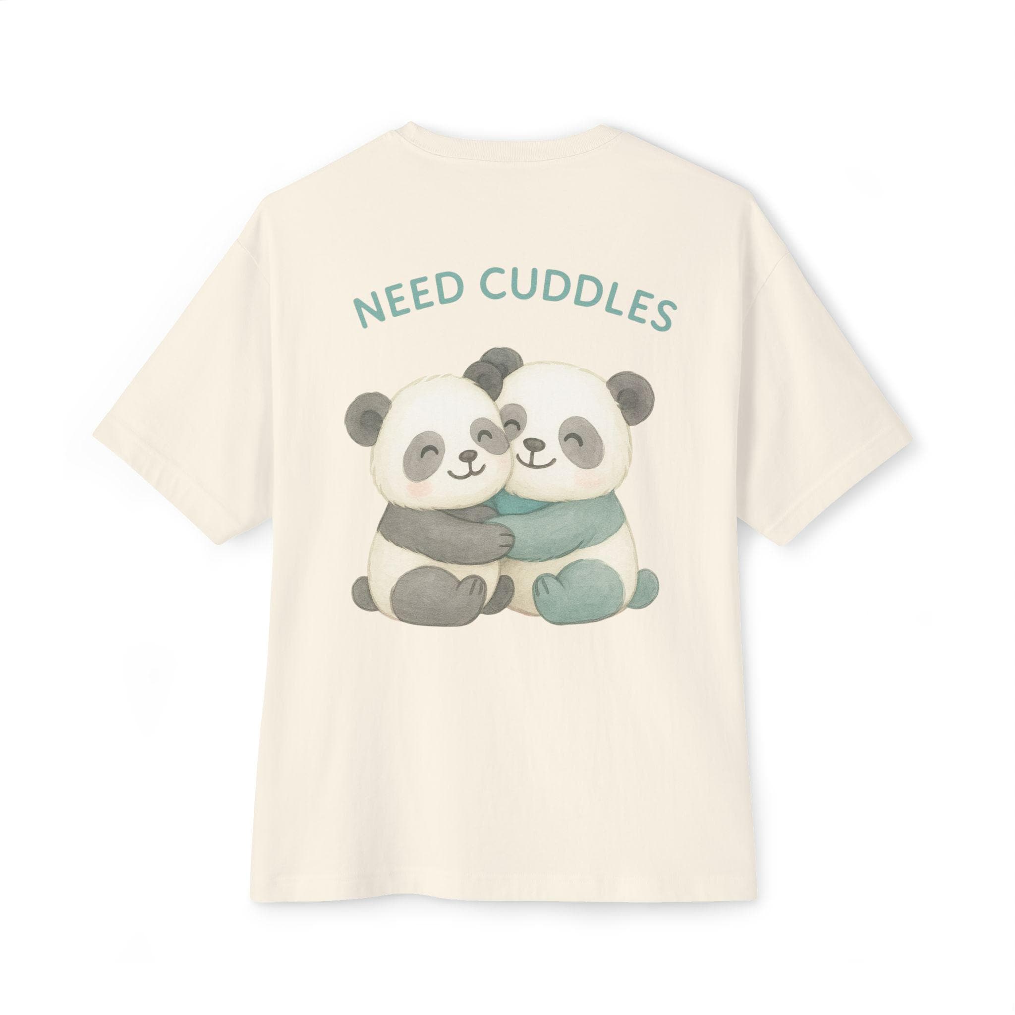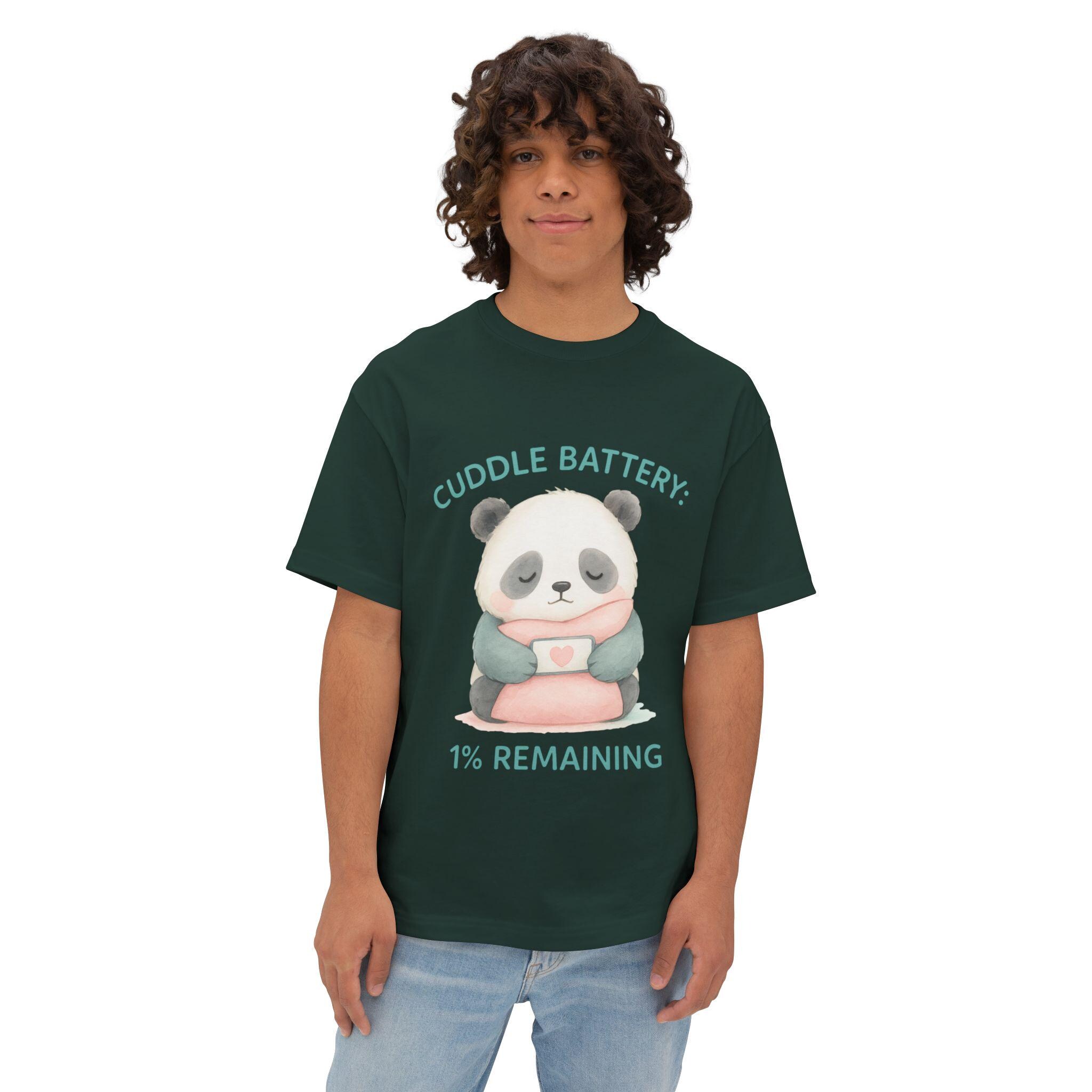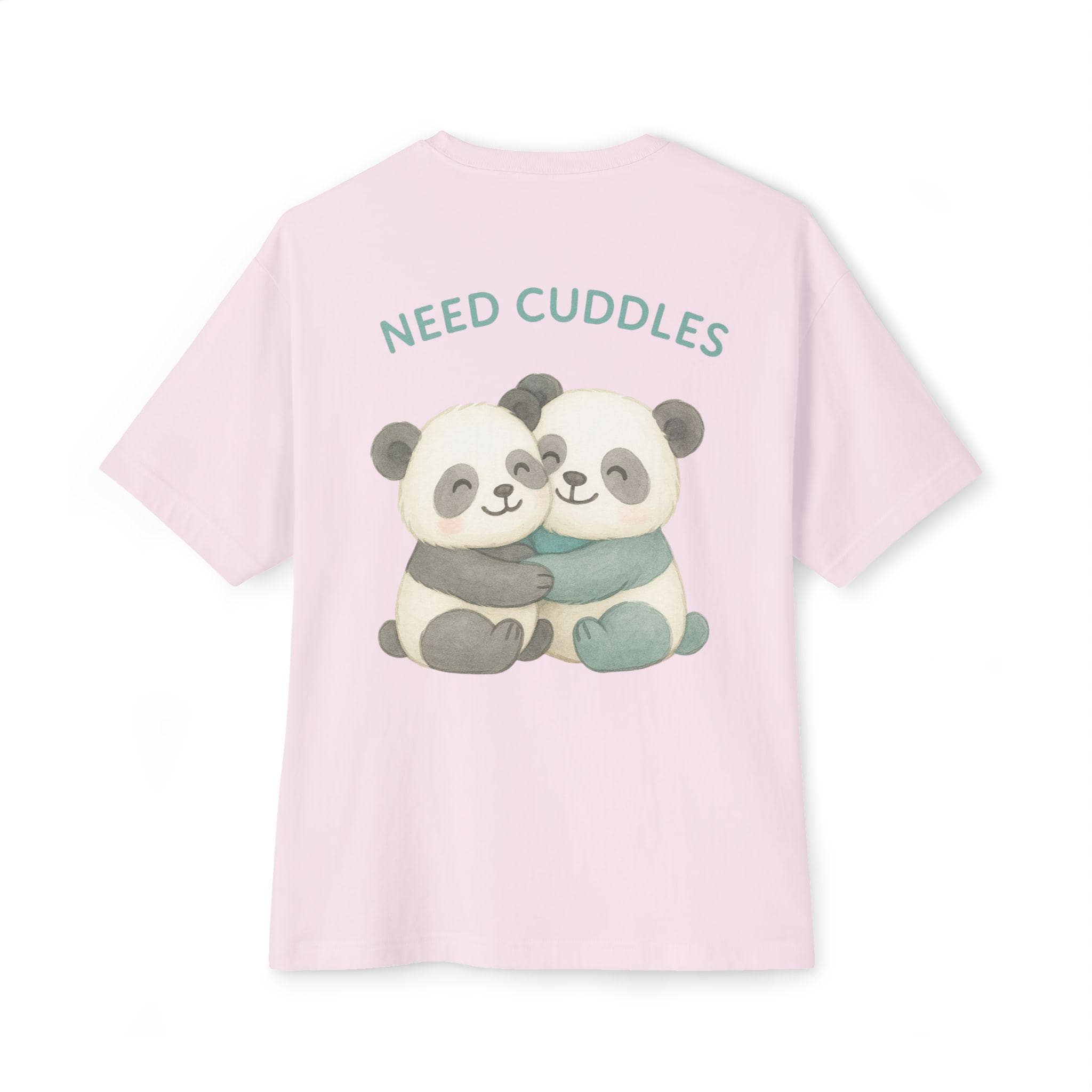 Soft and roomy, this oversized boxy tee carries a gentle, cozy mood. A sleepy panda clutching a heart-warmed mug sits on the front with the caption “Cuddle Battery: 1% Remaining,” while the back shows two pandas embracing under “Need Cuddles.” It feels like a slow afternoon with a blanket and warm drink — simple comfort you can wear. The relaxed, dropped-shoulder silhouette lets the art breathe and the wearer move freely, whether you’re lounging at home, running quick errands, or settling in for a movie night. The muted pastel palette and watercolor-style illustration speak quietly but clearly to anyone craving softness and low-key affection.