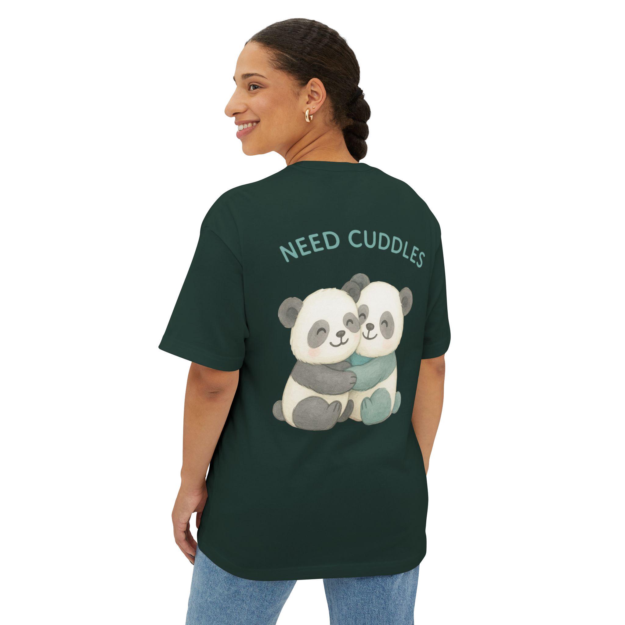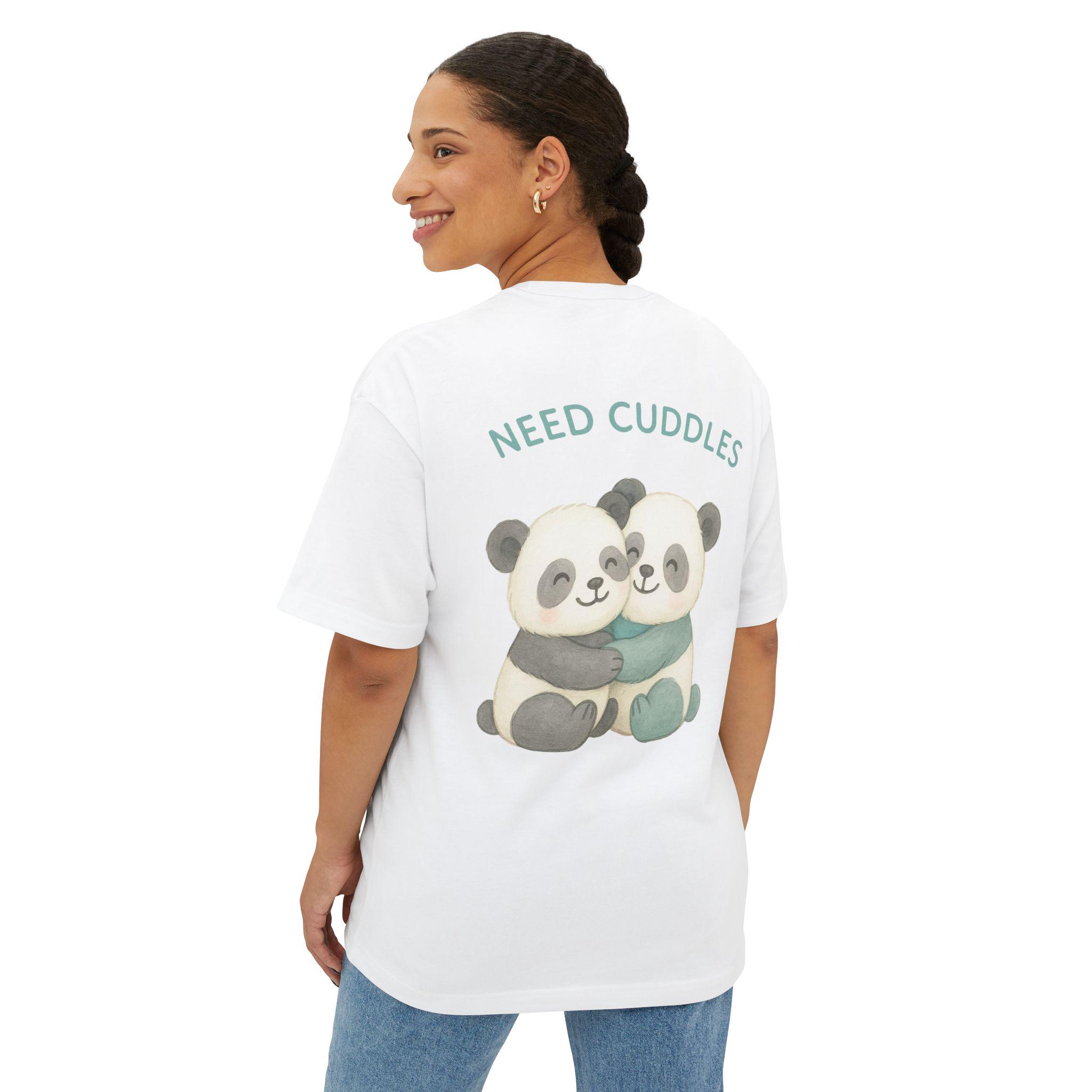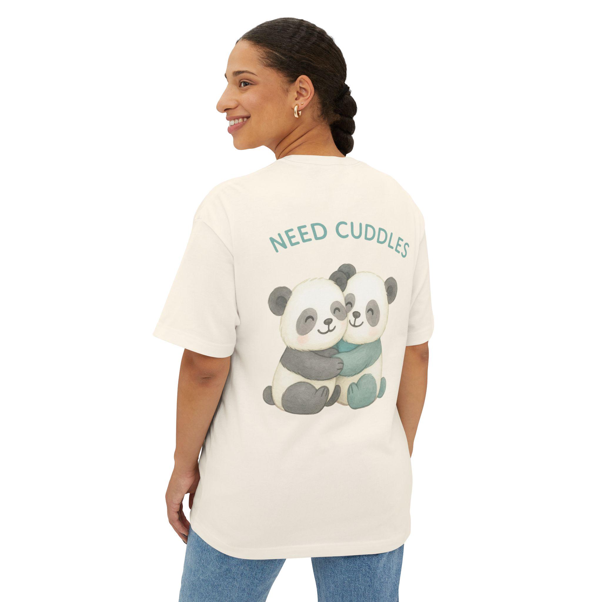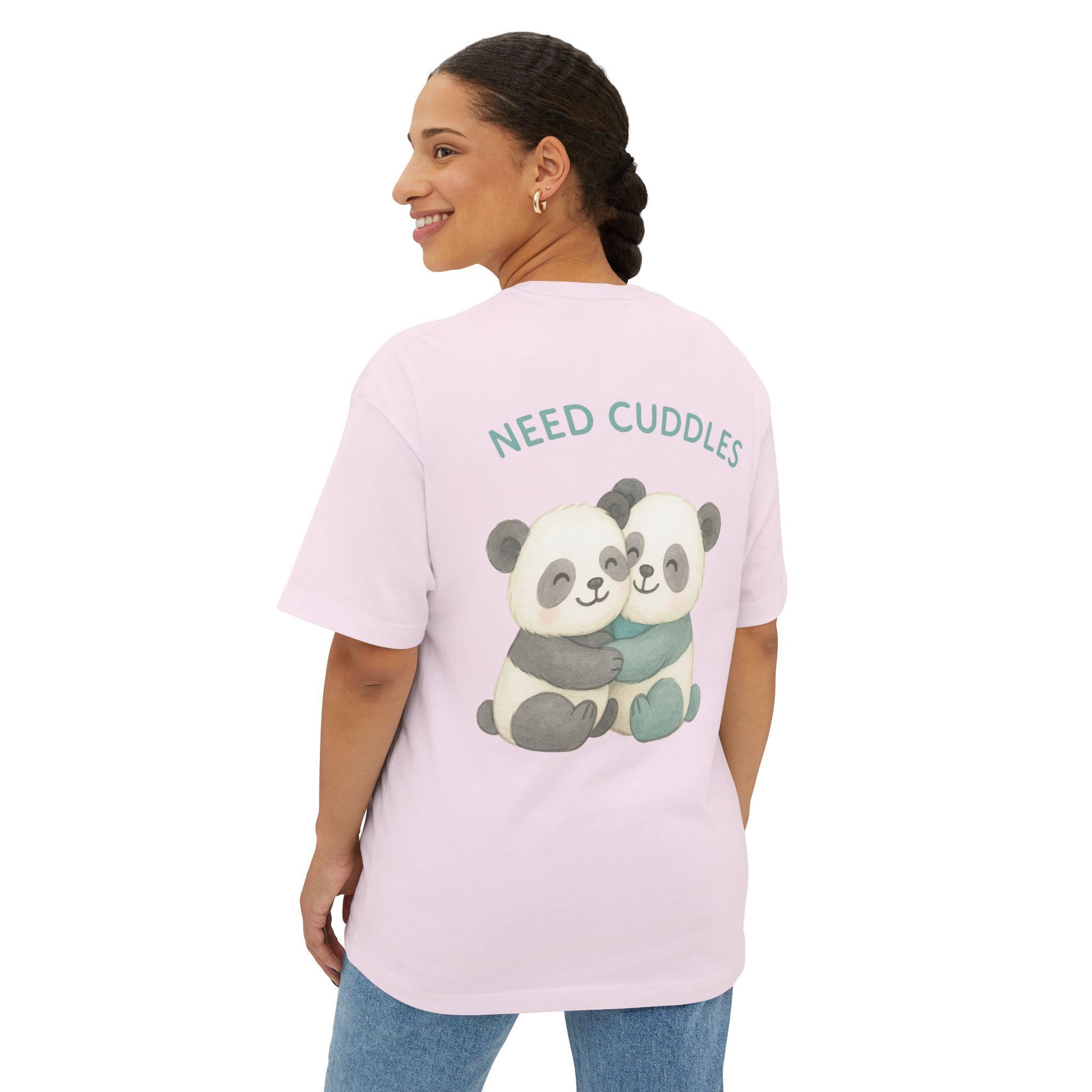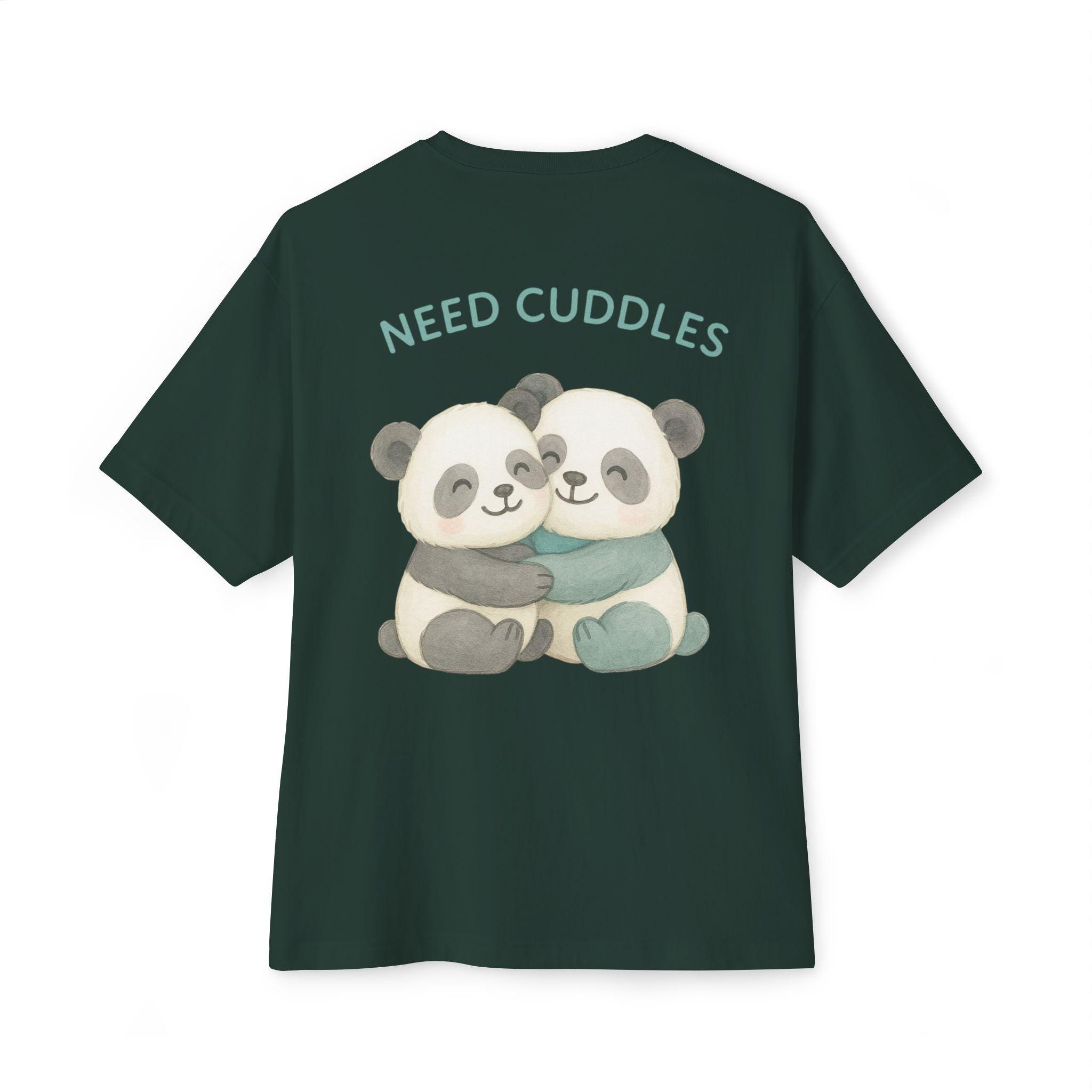 Soft and roomy, this oversized boxy tee carries a gentle, cozy mood. A sleepy panda clutching a heart-warmed mug sits on the front with the caption “Cuddle Battery: 1% Remaining,” while the back shows two pandas embracing under “Need Cuddles.” It feels like a slow afternoon with a blanket and warm drink — simple comfort you can wear. The relaxed, dropped-shoulder silhouette lets the art breathe and the wearer move freely, whether you’re lounging at home, running quick errands, or settling in for a movie night. The muted pastel palette and watercolor-style illustration speak quietly but clearly to anyone craving softness and low-key affection.
