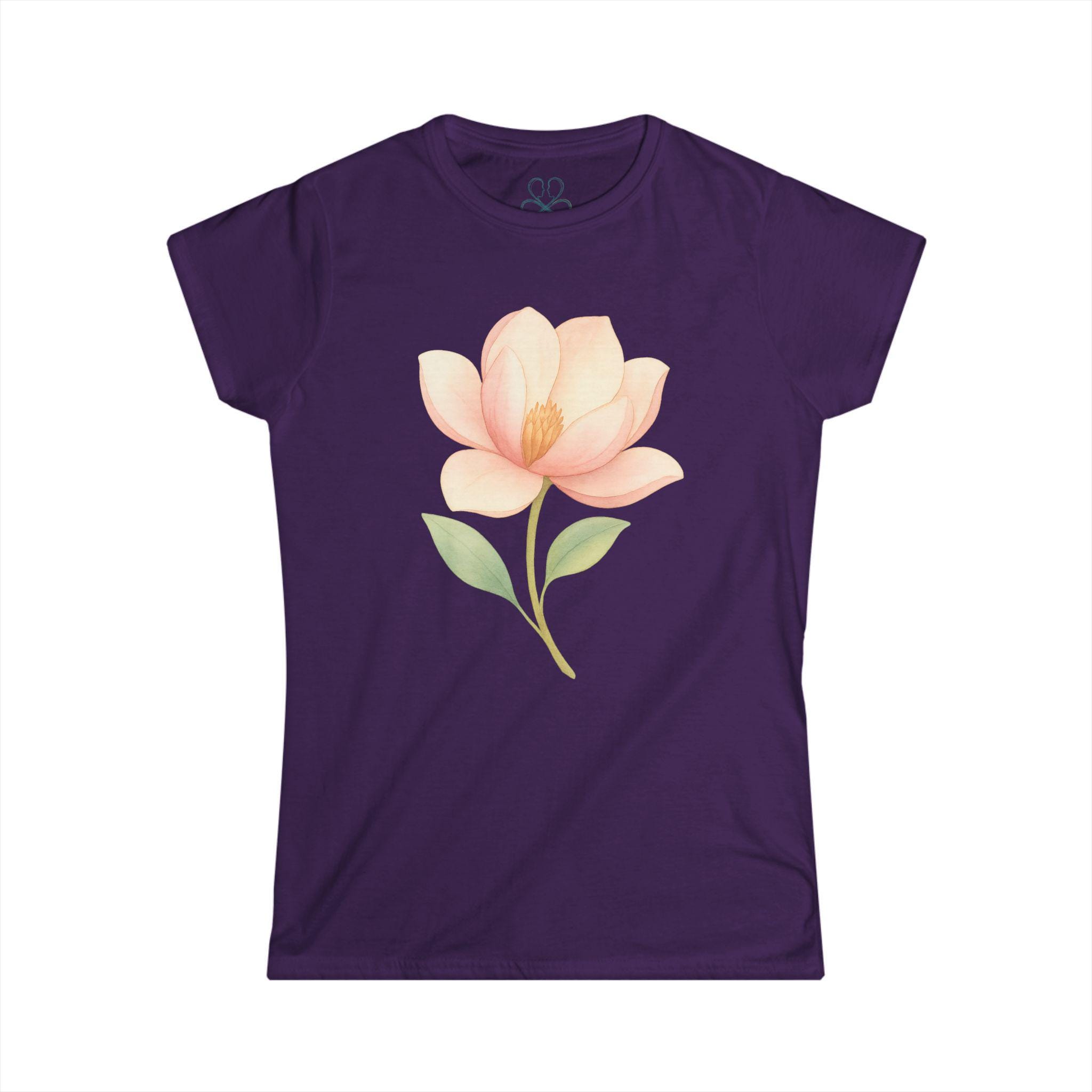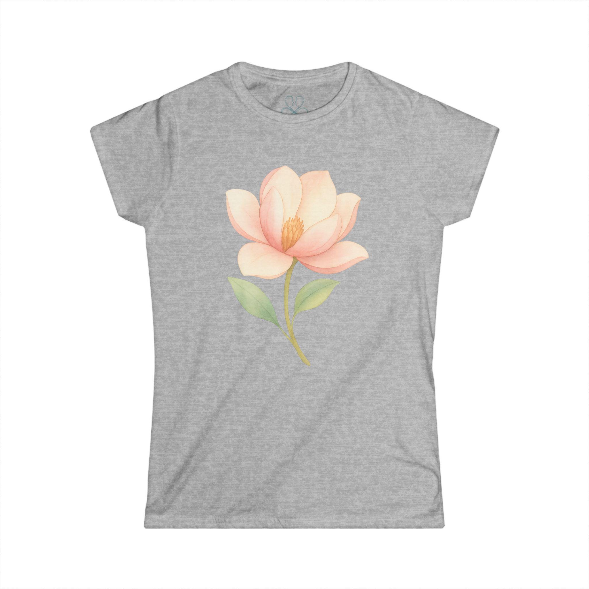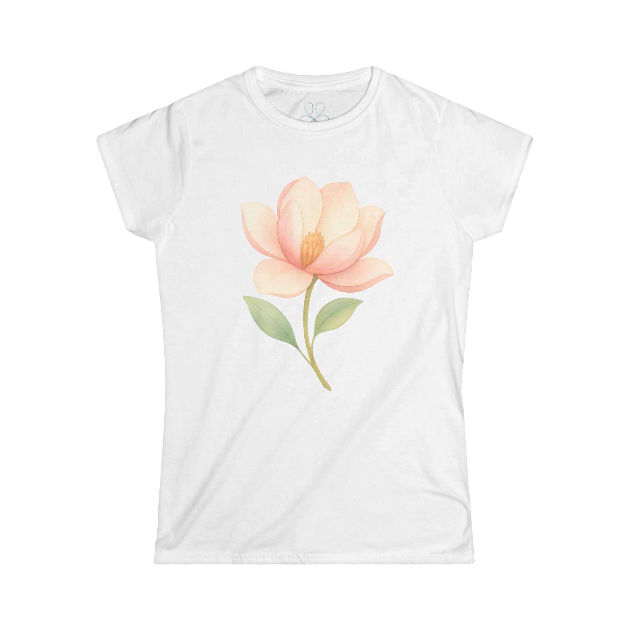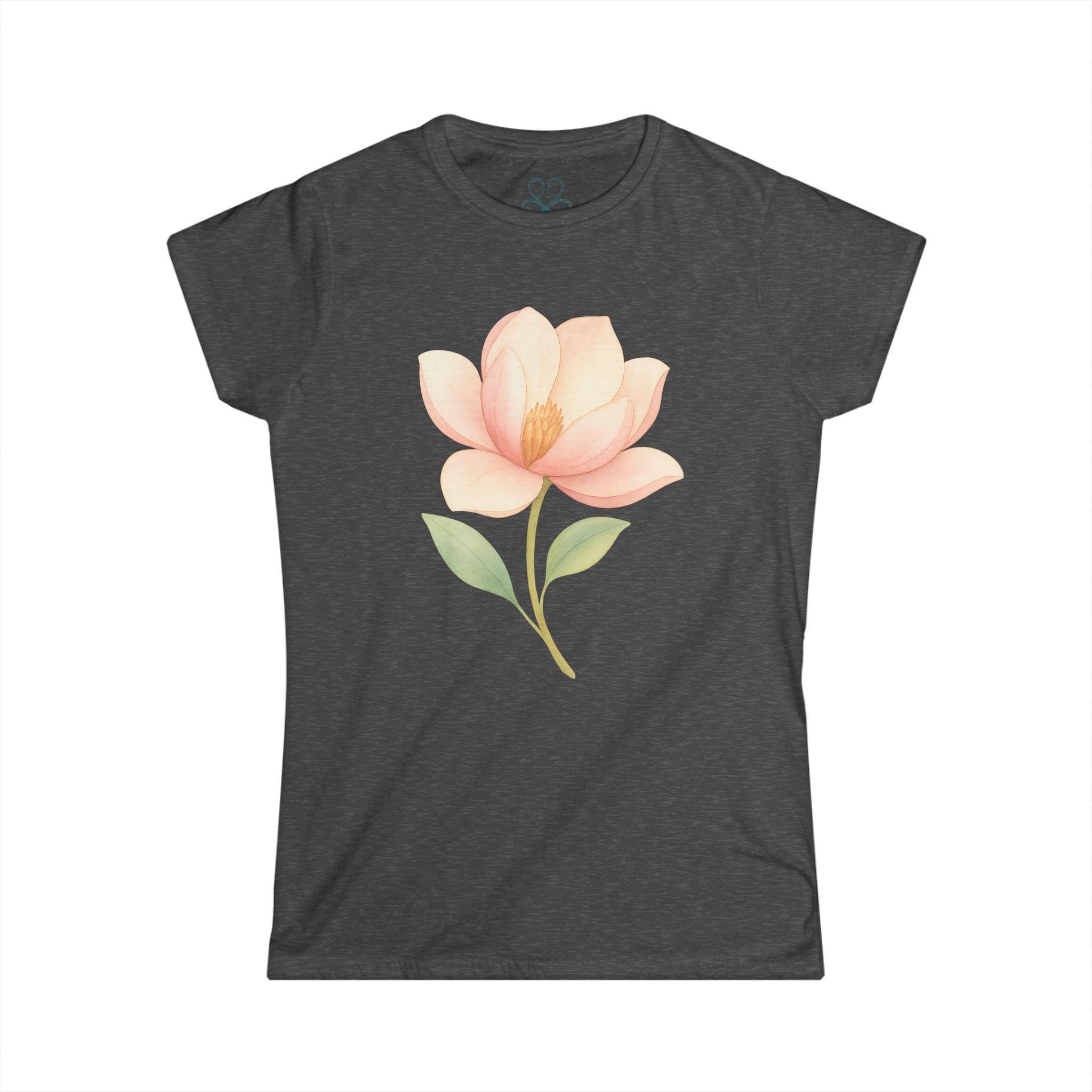 A lightweight, semi-fitted tee with a soft, hand-painted magnolia blossom at the center. Breathable ringspun cotton and a tear-away label keep it comfortable all day, while the ribbed collar and reinforced shoulder tape hold the shape through repeated wear. The delicate watercolor flower reads fresh and feminine — wear it alone for an effortless daytime look or layered under a cardigan for cooler evenings. It feels like a quiet garden moment: gentle, calm, and thoughtfully made to move with you.