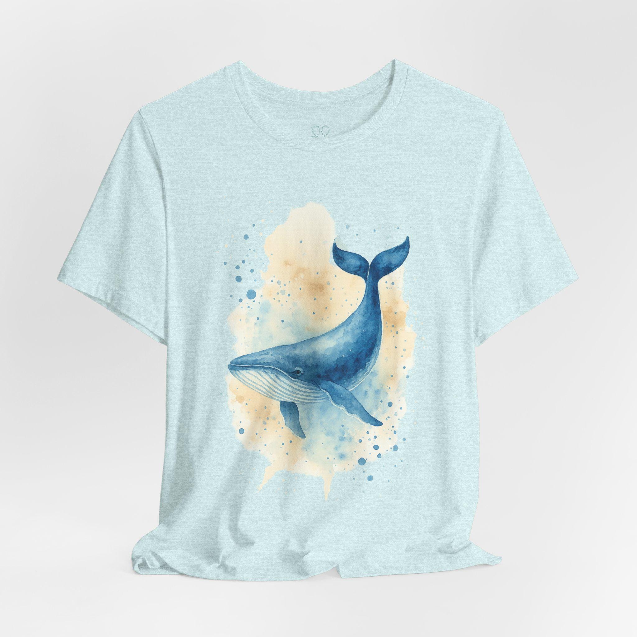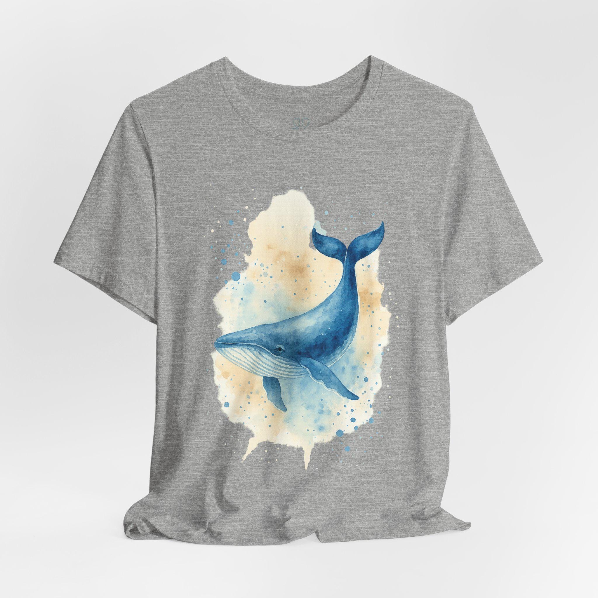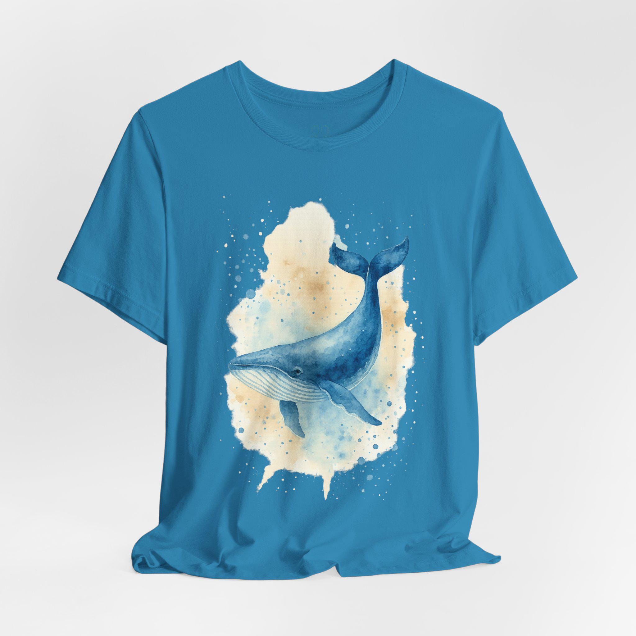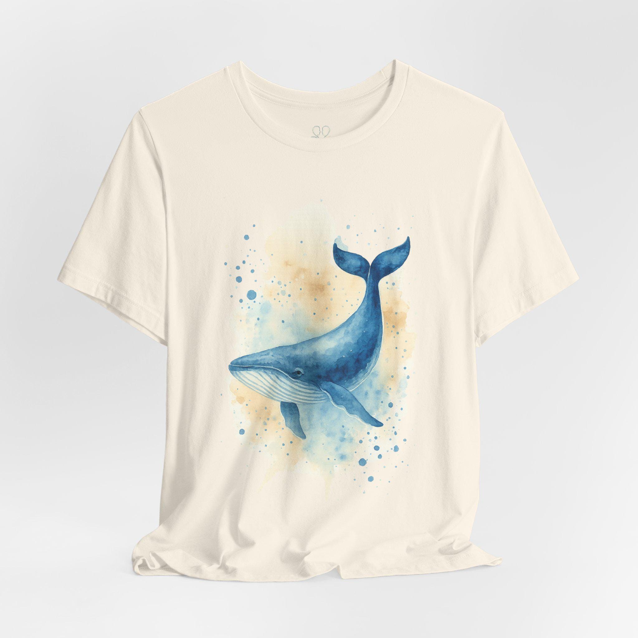 Soft, breathable cotton meets a gentle wash of ocean-blue art. This lightweight jersey tee carries a watercolor whale motif that feels like a lazy afternoon by the shore — calm, curious, and quietly joyful. The crew neck and retail fit keep the silhouette clean so the artwork sits front-and-center. Wear it on warm mornings, layered under a shirt jacket, or tossed into a weekend bag for coastal walks. The tear-away label and stable construction mean this tee stays comfortable and keeps its shape wear after wear.
