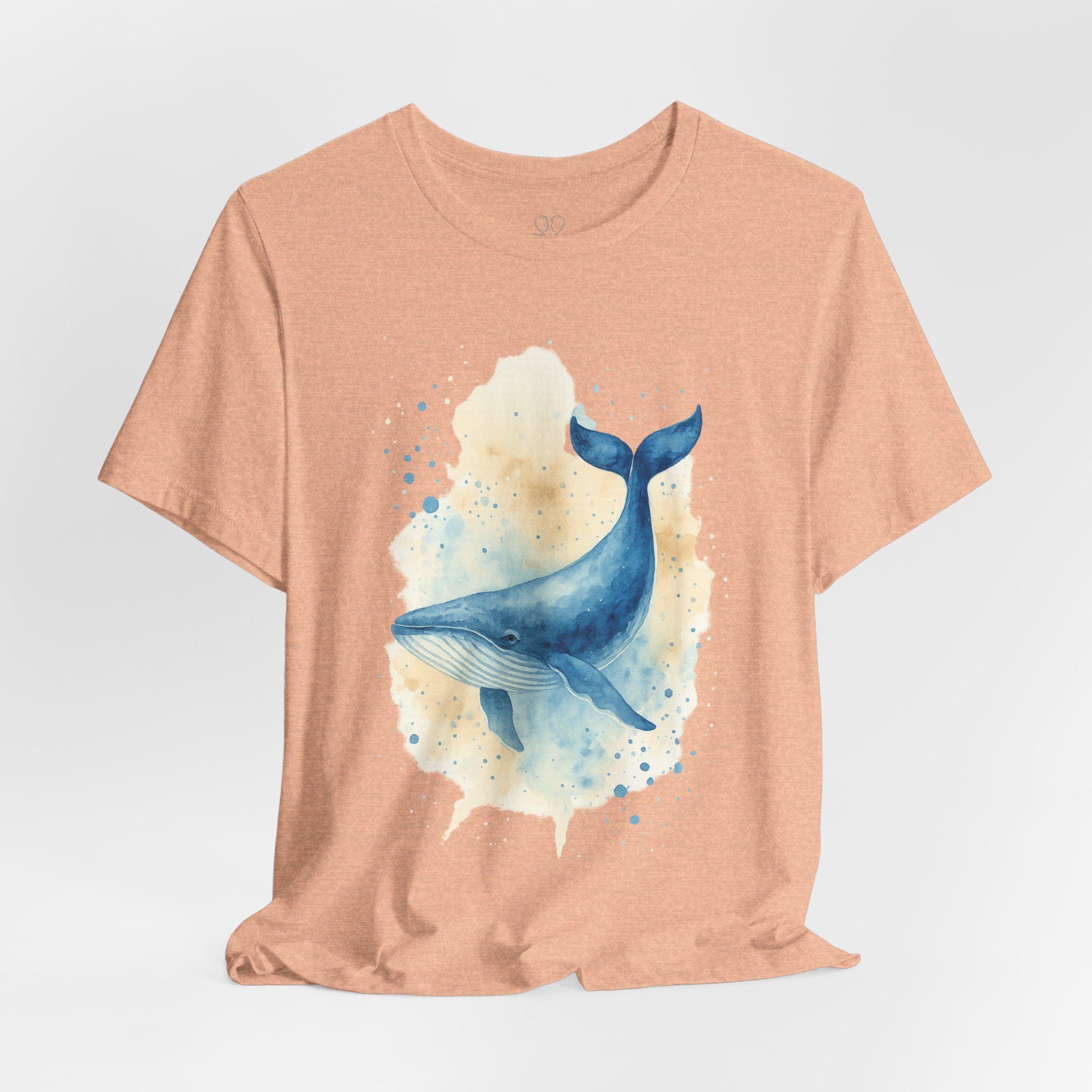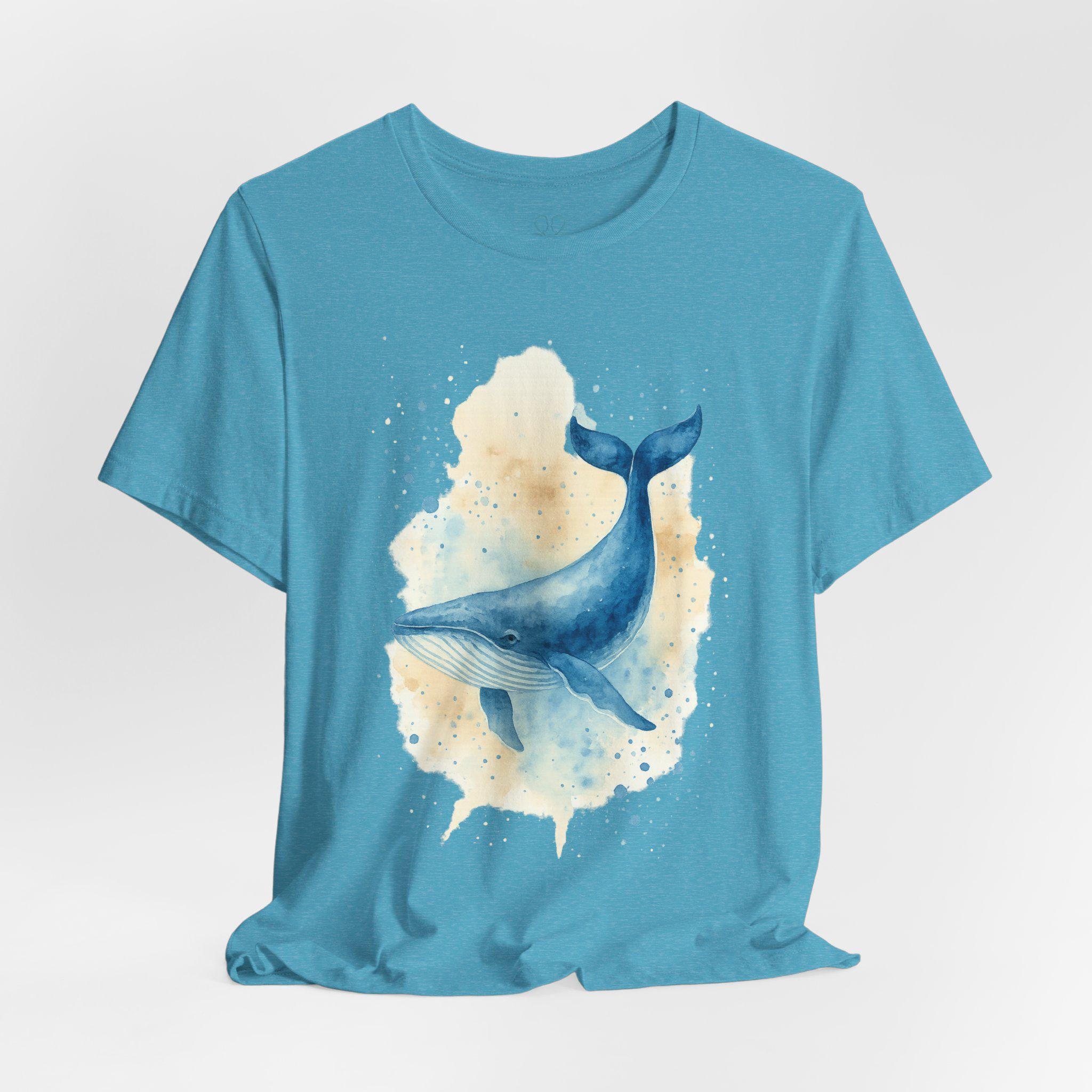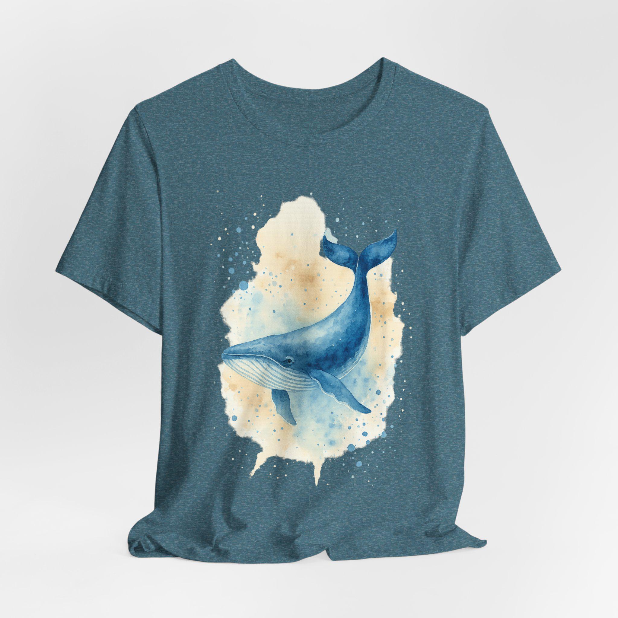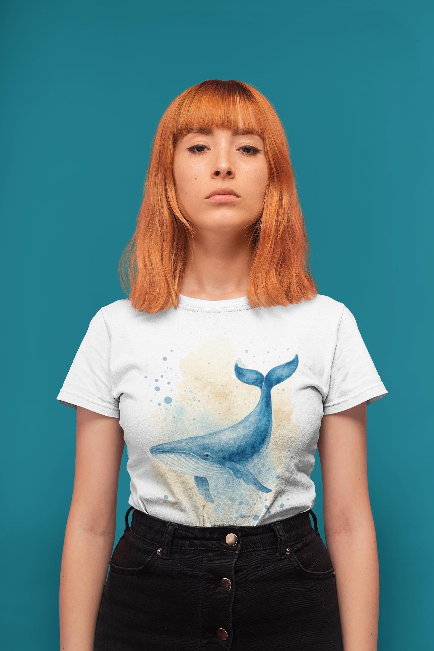 Soft, breathable cotton meets a gentle wash of ocean-blue art. This lightweight jersey tee carries a watercolor whale motif that feels like a lazy afternoon by the shore — calm, curious, and quietly joyful. The crew neck and retail fit keep the silhouette clean so the artwork sits front-and-center. Wear it on warm mornings, layered under a shirt jacket, or tossed into a weekend bag for coastal walks. The tear-away label and stable construction mean this tee stays comfortable and keeps its shape wear after wear.