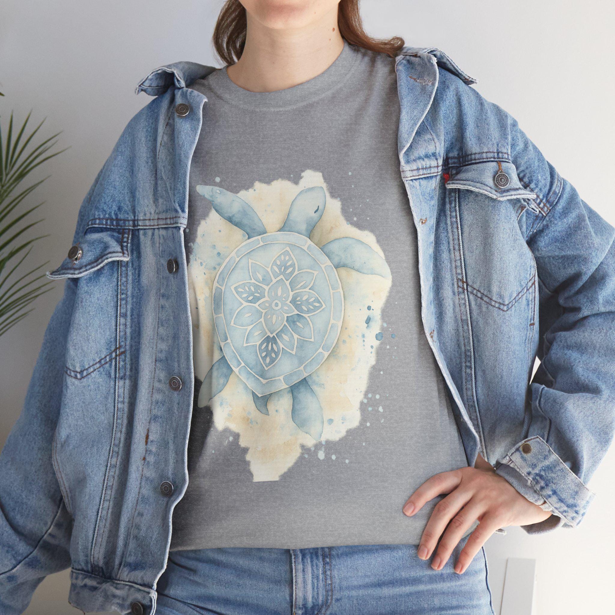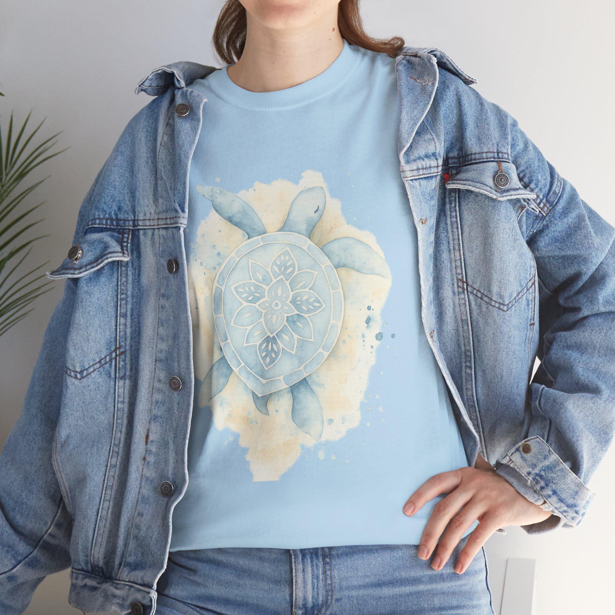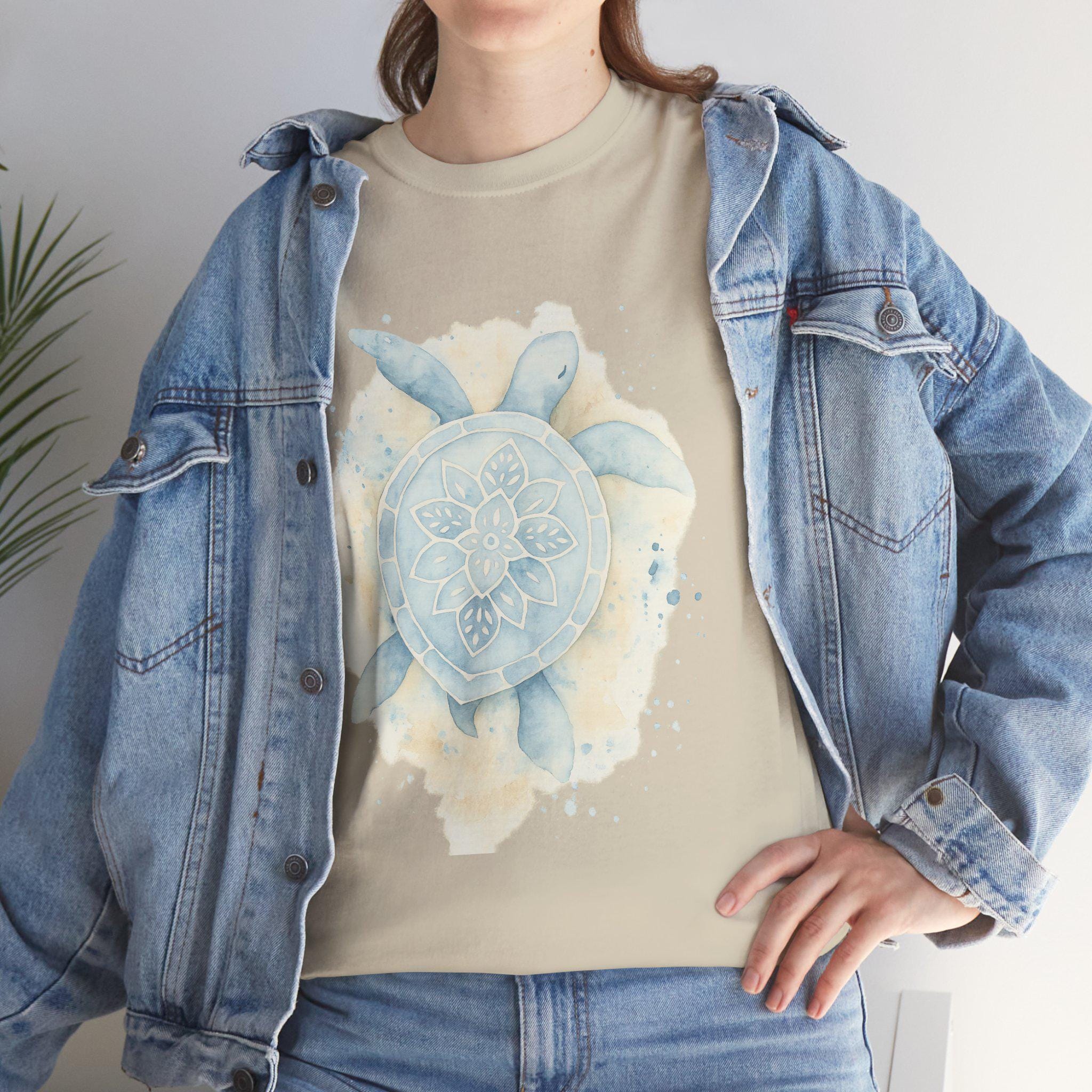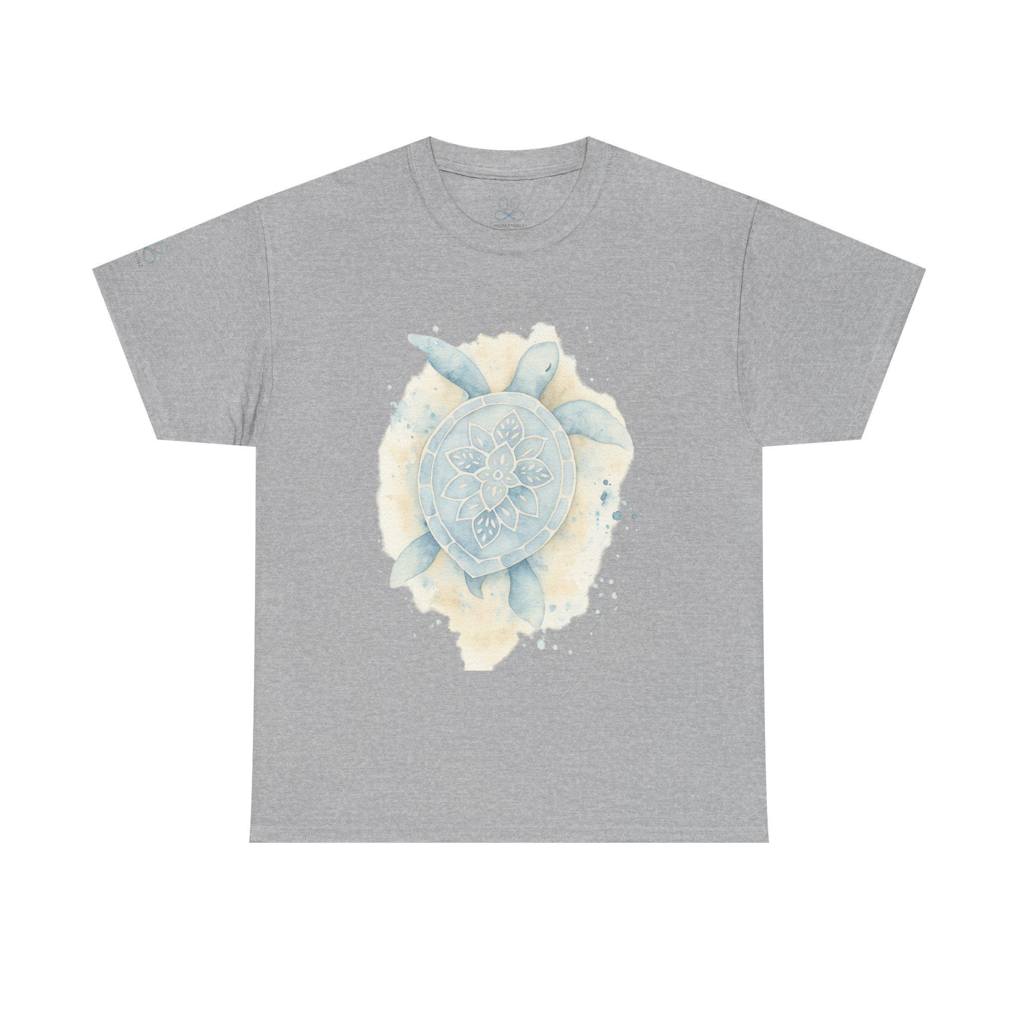 Soft white tee with a gentle watercolor sea-turtle at the center — quiet, breezy, and a little wistful. The faded blues and sandy washes make the turtle feel like a memory of tide pools and late-afternoon light. It drapes casually across the chest, so it reads like a personal talisman for people who slow down to notice shells, shorelines, and the small rhythms of the ocean. Wear it on beach walks, at low-key gatherings, or when you want to bring a little coastal calm into a busy day.