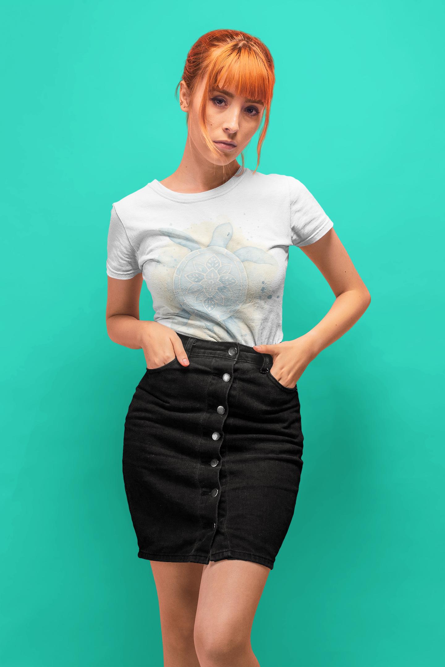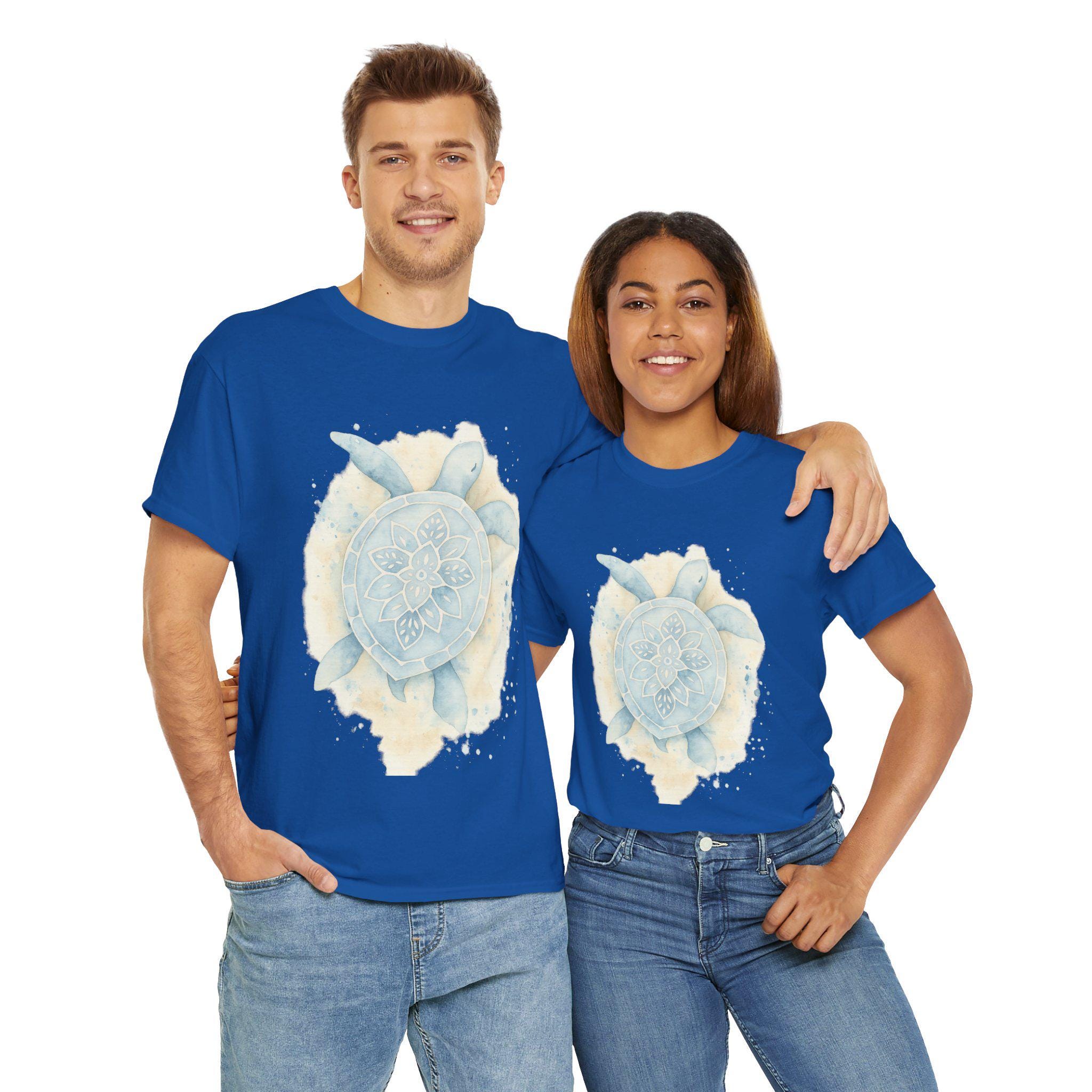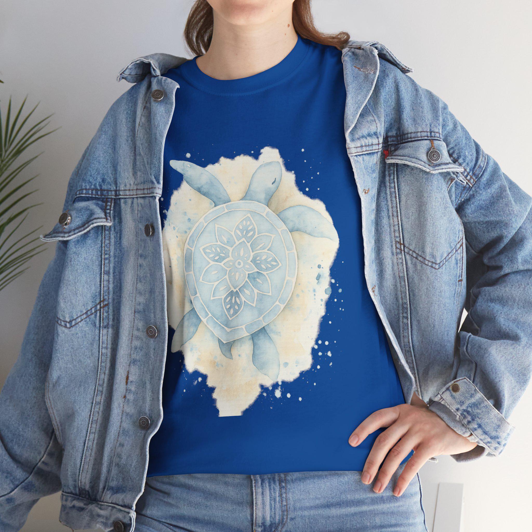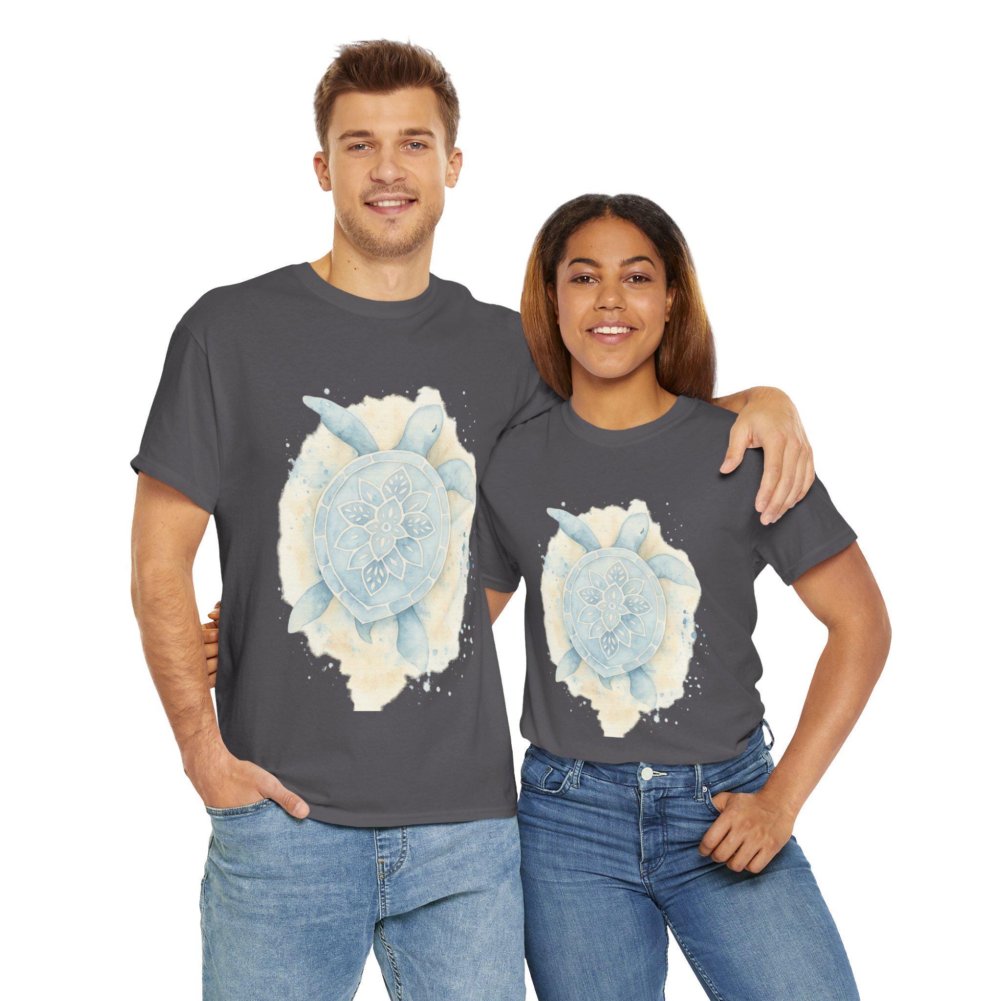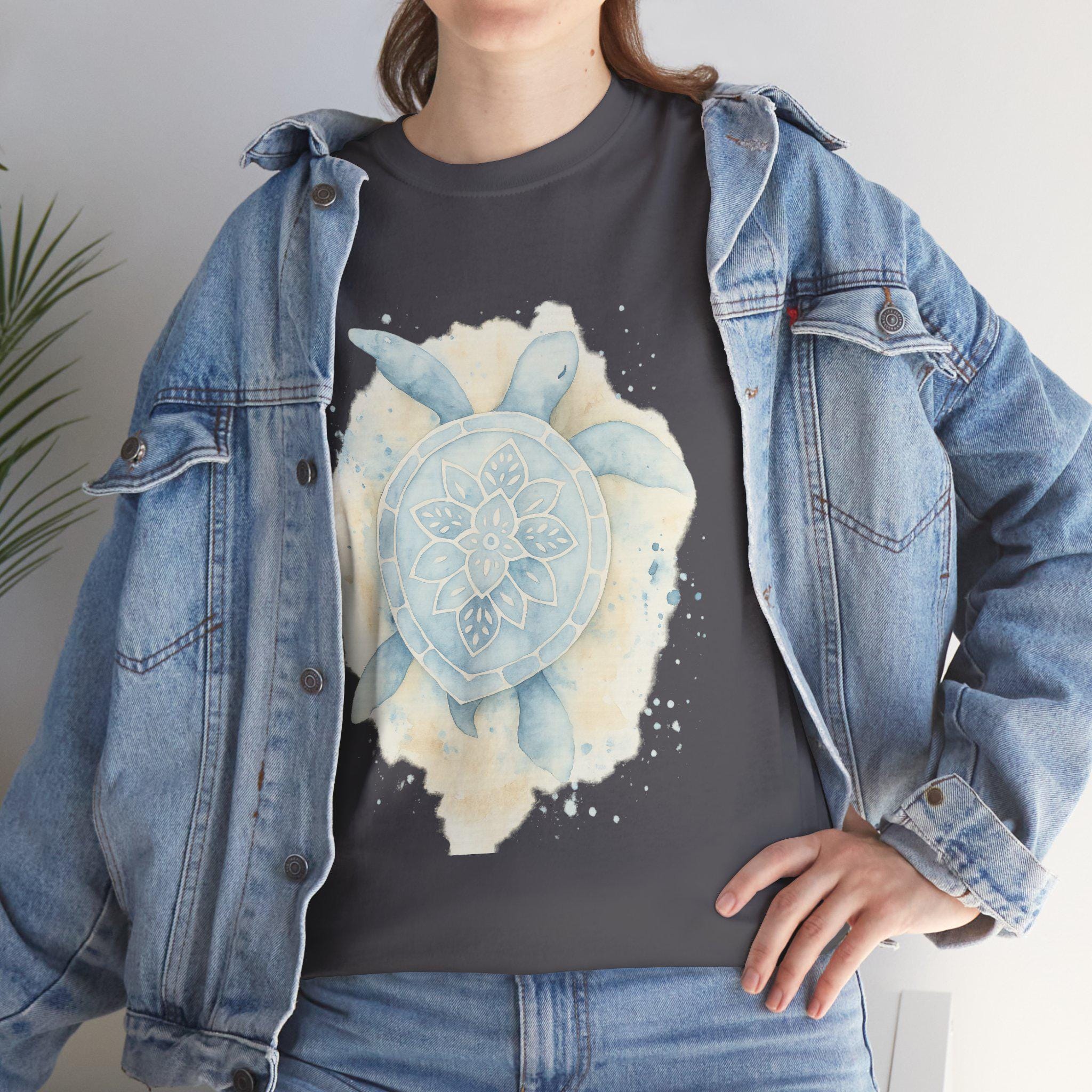 Soft white tee with a gentle watercolor sea-turtle at the center — quiet, breezy, and a little wistful. The faded blues and sandy washes make the turtle feel like a memory of tide pools and late-afternoon light. It drapes casually across the chest, so it reads like a personal talisman for people who slow down to notice shells, shorelines, and the small rhythms of the ocean. Wear it on beach walks, at low-key gatherings, or when you want to bring a little coastal calm into a busy day.